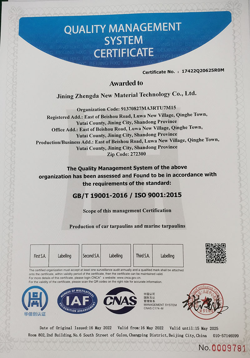 质量管理体系认证证书英文